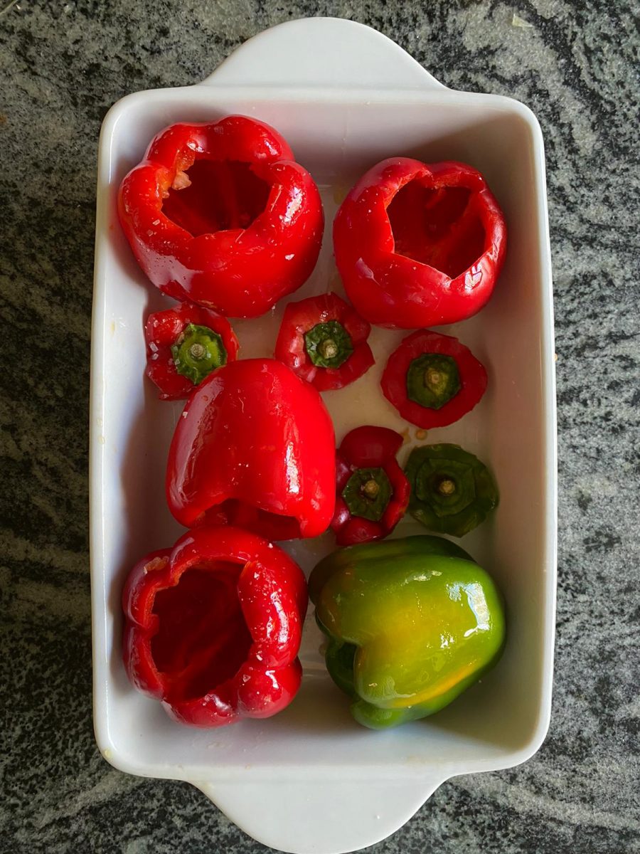 - In a bowl, massage the peppers evenly in olive oil. Set on the sheet pan to roast for twenty minutes.