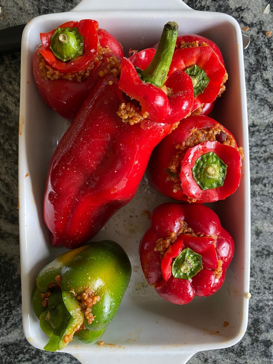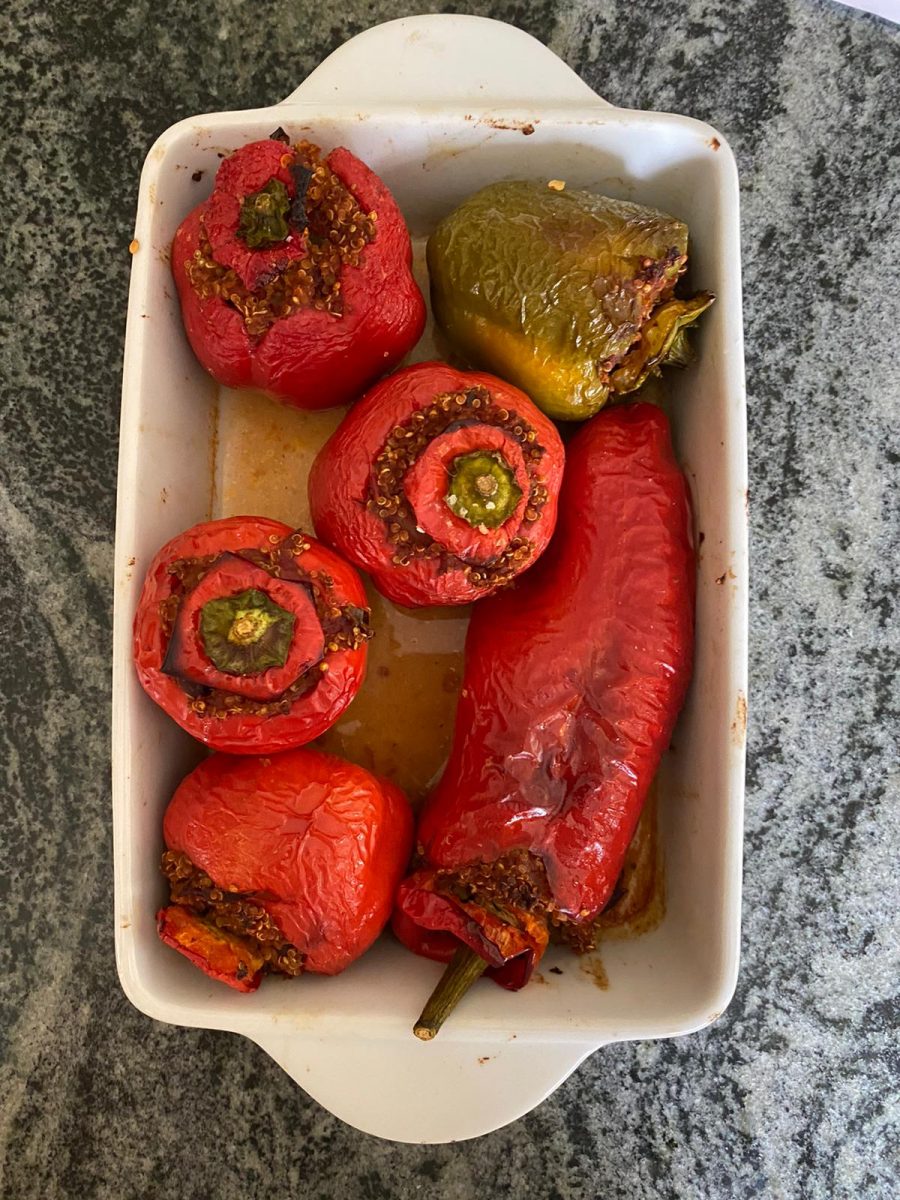 - Spoon the chilli and quinoa mixture into the pepper, packing them tightly and replacing the lids.