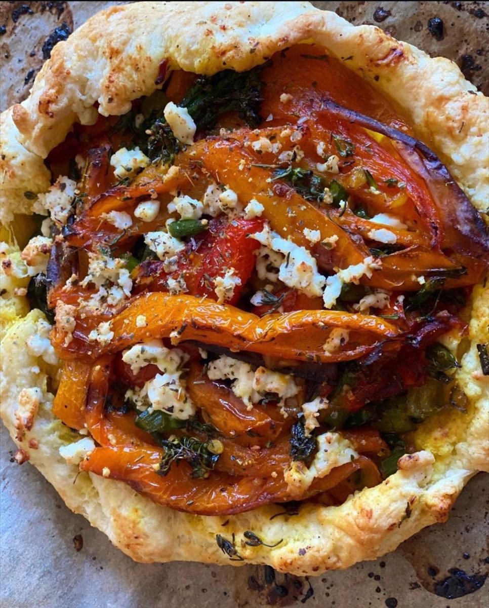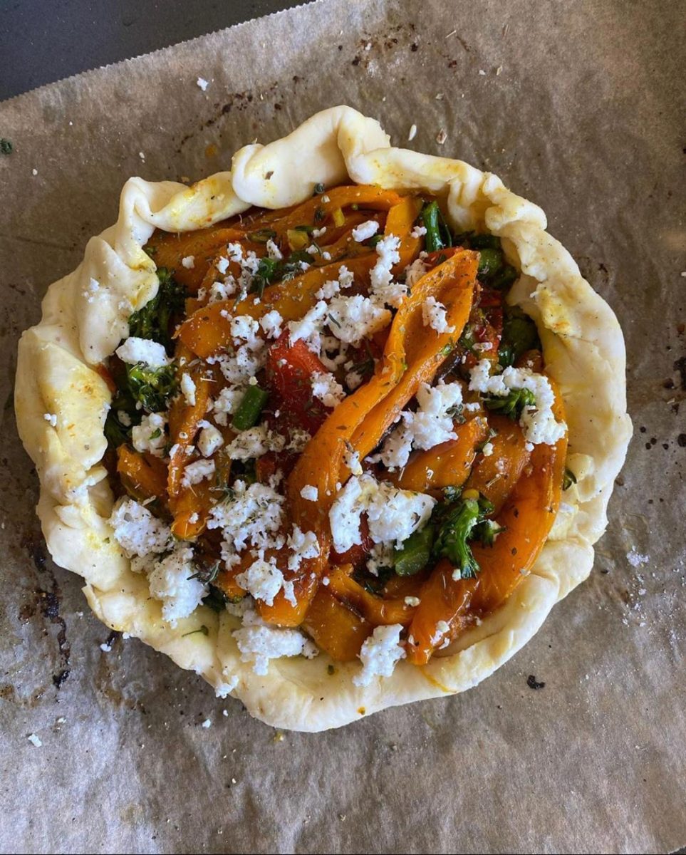 The galette has a lovely Mediterranean theme. It is full of fresh, simple and delicately spiced ingredients to enhance, whilst tangy feta and pastry create an oozy and comforting texture.